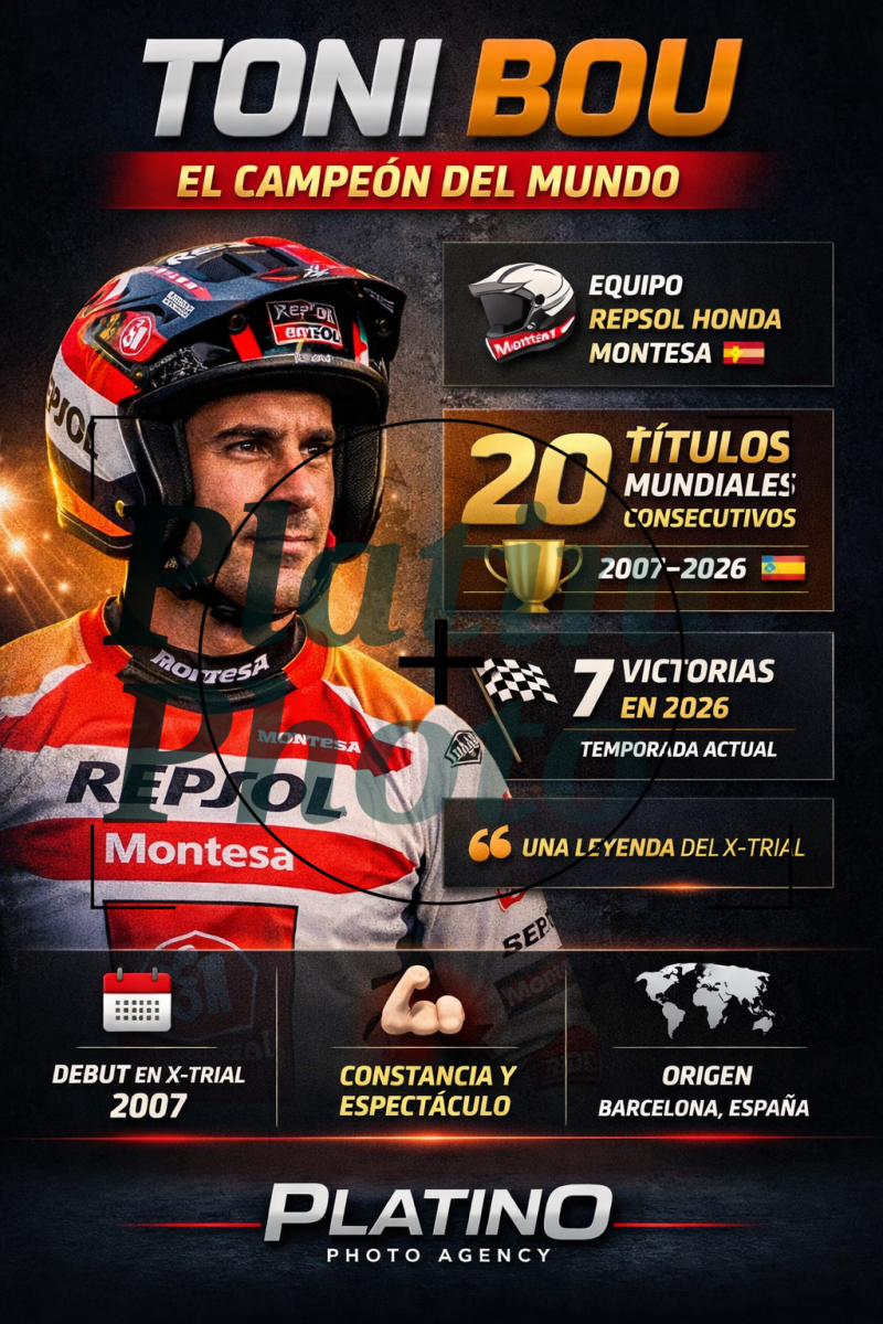 Con 20 títulos mundiales consecutivos, Toni Bou se ha convertido en una auténtica leyenda del deporte. Su nombre es sinónimo de excelencia, constancia y espectáculo en el mundo del trial. Desde su debut internacional hasta su última victoria en Chalon-sur-Saône 2026, Bou ha redefinido lo que significa ser campeón.